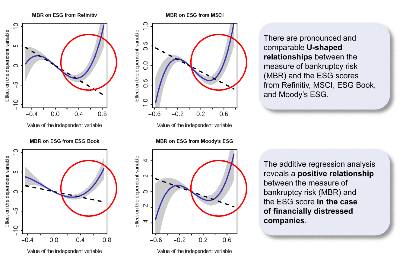In unserer neuesten empirischen Studie wird die Beziehung zwischen der finanziellen Notlage eines Unternehmens, die anhand eines Insolvenzprognosemodells ermittelt wurde, und ESG-Scores von Refinitiv, MSCI, ESG Book und Moody's ESG analysiert. Die Anwendung nichtparametrischen Regressionsmodelle auf Paneldaten von börsennotierten US-Unternehmen für den Zeitraum 2003-2022 zeigt eine statistisch signifikante U-förmige Beziehung zwischen der finanzieller Notlage und ESG-Bewertungen von Unternehmen. Finanziell angeschlagene Unternehmen weisen hohe ESG-Bewertungen auf. Die empirische Evidenz zeigt, dass die hohen ESG-Scores finanziell angeschlagener Unternehmen nicht durch frühere Investitions- und F&E-Ausgaben oder durch die tatsächliche Energieintensität der Einnahmen eines Unternehmens erklärt werden können, sondern dass sie in einem signifikantem Zusammenhang mit der Stakeholder-Orientierung eines Unternehmens stehen. Darüber hinaus stehen die hohen ESG-Scores finanziell angeschlagener Unternehmen eher mit vorhersehbaren unternehmensbezogenen Ursachen als mit unvorhersehbaren exogenen Ursachen finanzieller Notlagen in Zusammenhang. Die plausibelste Interpretation ist, dass Unternehmen ihre bevorstehende finanzielle Notlage antizipieren und die ESG-unterstützende Offenlegung intensivieren, um ihre ESG-Werte nach oben zu steuern. Das empirisch beobachtbare, systematische Management von ESG-Scores durch die Gruppe der finanziell angeschlagenen Unternehmen reduziert die Validität und Glaubwürdigkeit von ESG-Scores und macht es zwingend notwendig, den Grad der finanziellen Notlage eines Unternehmens bei der Interpretation von ESG-Scores zu berücksichtigen.